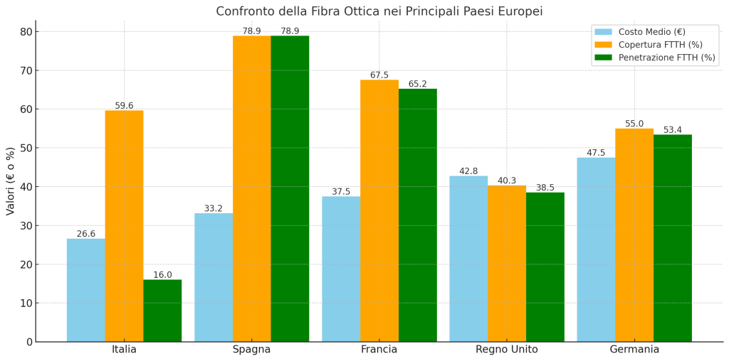 Ecco un confronto visivo dei principali indicatori della fibra ottica nei principali Paesi europei. Noterai subito che, se da un lato l’Italia guida per convenienza, dall’altro emergono evidenti gap in copertura e penetrazione.